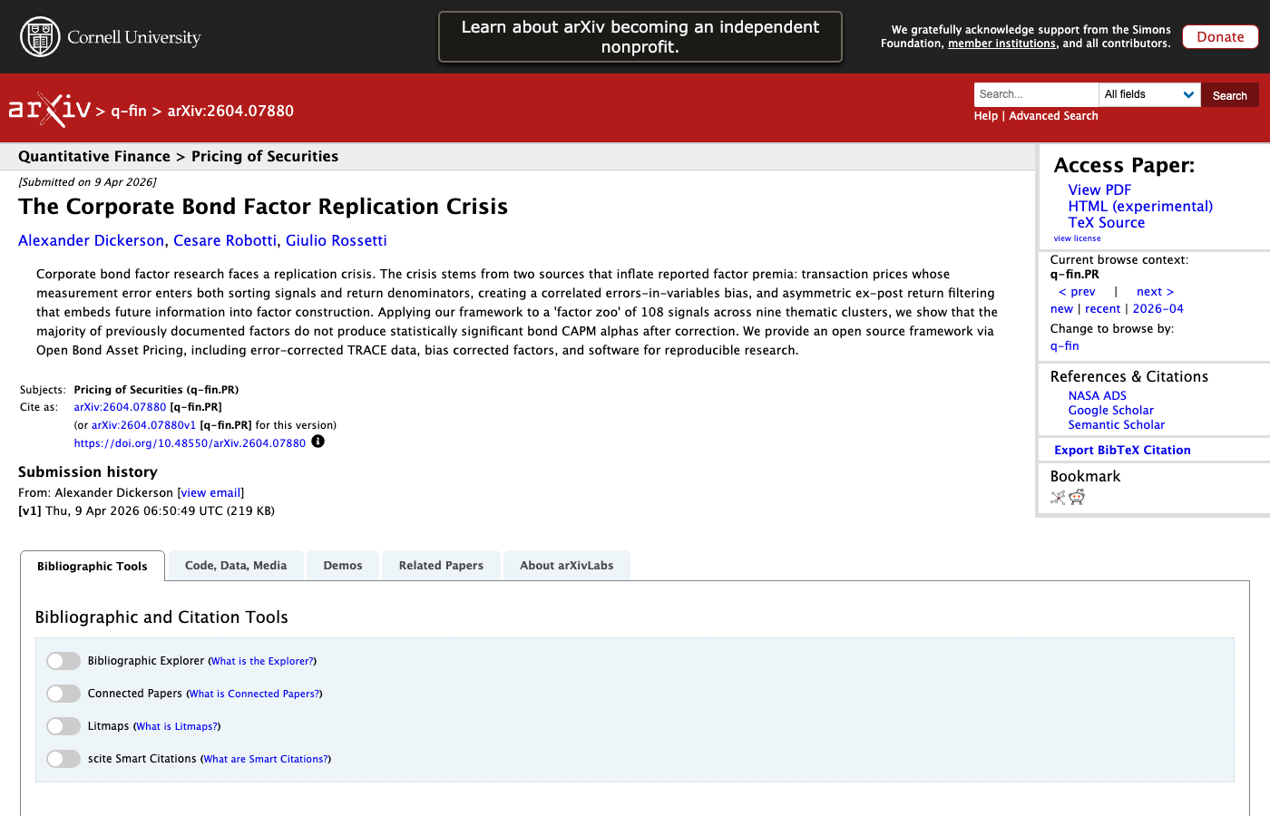 A preprint posted to arXiv on April 9, 2026, argues that nearly a decade of academic work on corporate bond "factors" — the systematic sources of excess return that underpin much of the actively managed corporate bond strategy universe — is in a replication crisis. The paper, "The Corporate Bond Factor Replication Crisis" by Alexander Dickerson, Cesare Robotti, and Giulio Rossetti, tests a "factor zoo" of 108 previously published signals across nine thematic clusters and finds that the majority stop producing statistically significant bond-CAPM alphas once two specific biases are corrected.