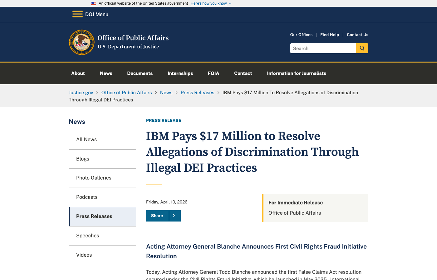 The Justice Department announced Friday that International Business Machines Corporation has agreed to pay $17,077,043 — civil penalties included — to resolve False Claims Act allegations that its diversity, equity, and inclusion practices amounted to unlawful discrimination against employees and applicants "because of race, color, national origin, or sex." According to the DOJ press release, it is the first resolution secured under the Civil Rights Fraud Initiative that Acting Attorney General Todd Blanche launched in May 2025.