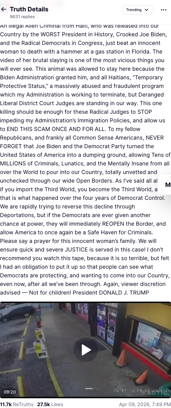 Trump posted graphic surveillance video on Truth Social of a fatal hammer attack at a Fort Myers gas station, using the case of a Haitian immigrant charged with murder to demand an end to TPS -- two and a half weeks before the Supreme Court hears the case.