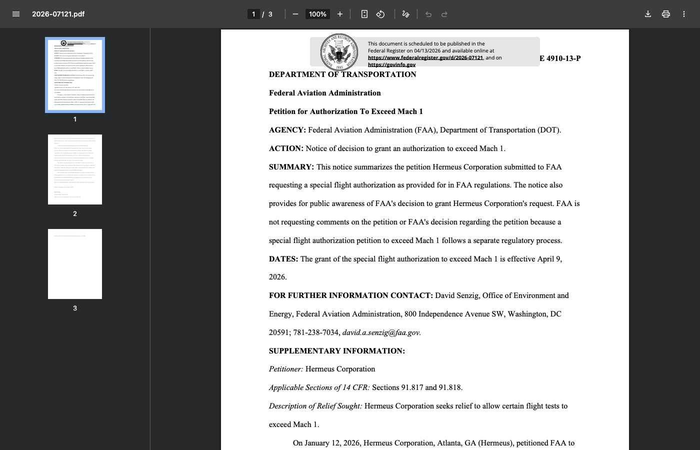 The Federal Aviation Administration has granted Atlanta-based hypersonic aircraft startup Hermeus Corporation a Special Flight Authorization under 14 CFR § 91.818 to conduct supersonic developmental flight testing of its Quarterhorse Mark 2.1 uncrewed aircraft, according to a Federal Register notice currently on public inspection and scheduled for formal publication on April 13. The authorization took effect April 9, 2026.