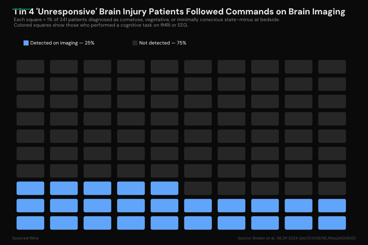 A prospective study of 353 adults with disorders of consciousness at six international centers detected command-following on brain imaging in 60 of 241 patients (25%) whose bedside examination found no observable response. Published in the New England Journal of Medicine in August 2024, the findings mean 1 in 4 patients clinically diagnosed as comatose, vegetative, or minimally conscious were covertly performing cognitive tasks that their doctors could not detect.