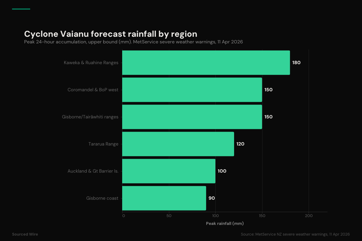 New Zealand's national weather service has issued Red strong-wind warnings — its most severe category — for Coromandel Peninsula, Bay of Plenty and Great Barrier Island as former Tropical Cyclone Vaianu moves south over the North Island. In its severe weather bulletin published on the morning of Saturday, April 11, MetService described the event as "a multi-hazard, potentially life-threatening" combination of damaging winds, heavy rain and coastal inundation, forecasting damaging gusts of 130 km/h in exposed places and rainfall totals of up to 180 mm across inland ranges.